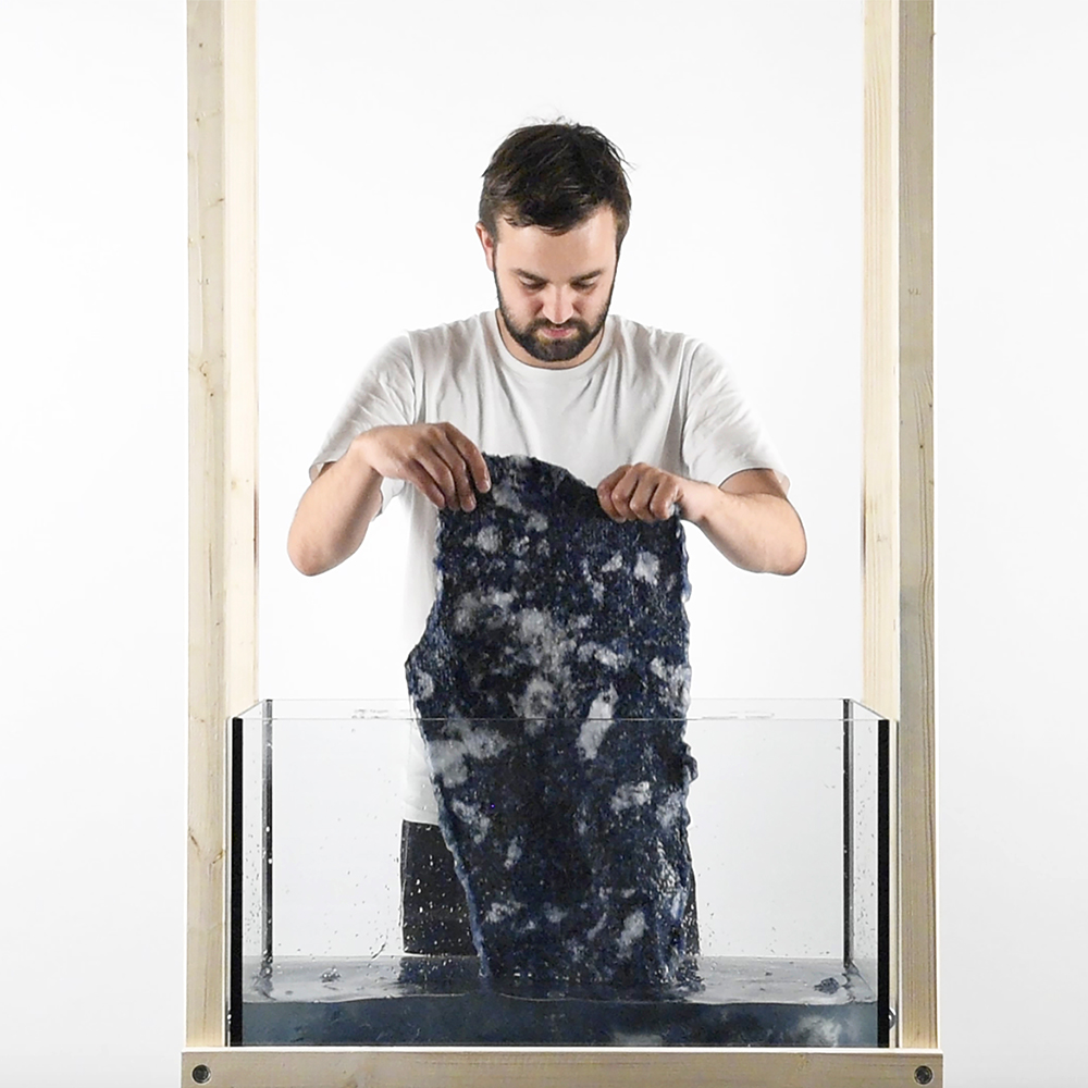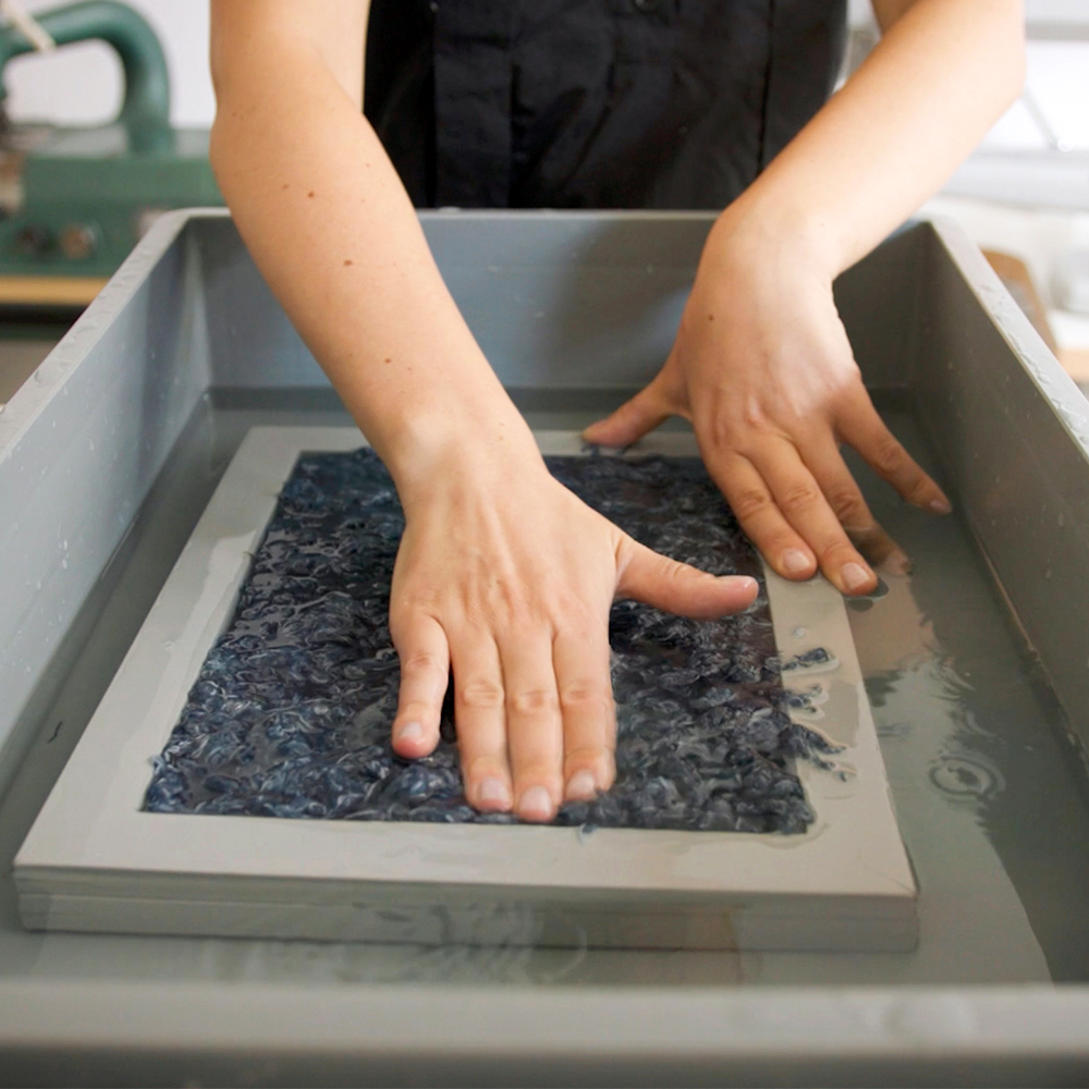 New Blue interpretiert traditionelle Papierherstellungstechniken durch Textilrecycling neu. Anstelle von Papierbrei werden ausrangierte Jeans von Hand in kleine Stücke geschnitten, zerkleinert und auf ein feines, über einen Holzrahmen gespanntes Netz gegossen. Wenn die Denimfasern freigesetzt und getrocknet sind, verbinden sie sich wie Papier miteinander und bilden ein handgefertigtes, recyceltes Vliesstofftextil. Dieses Jeansfleece wird dann mit Industriemaschinen bestickt, um das Material zu verstärken.
