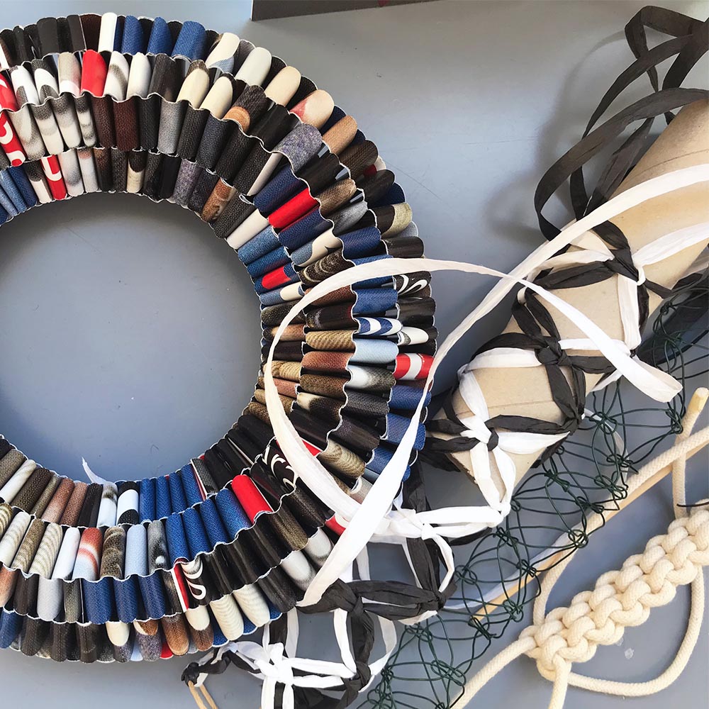 Vermittelt werden Grundlagen zu Techniken aus den Bereichen Einhängen, Verschlingen, Knoten und Flechten. Die Frage, wozu die Techniken eingesetzt wurden und noch immer eingesetzt werden, begleitet unsere praktische Arbeit. Wir verarbeiten verschiedene Materialien, es entsteht eine Musterkollektion, welche späteres freies Weiterarbeiten zu Hause ermöglichen soll.